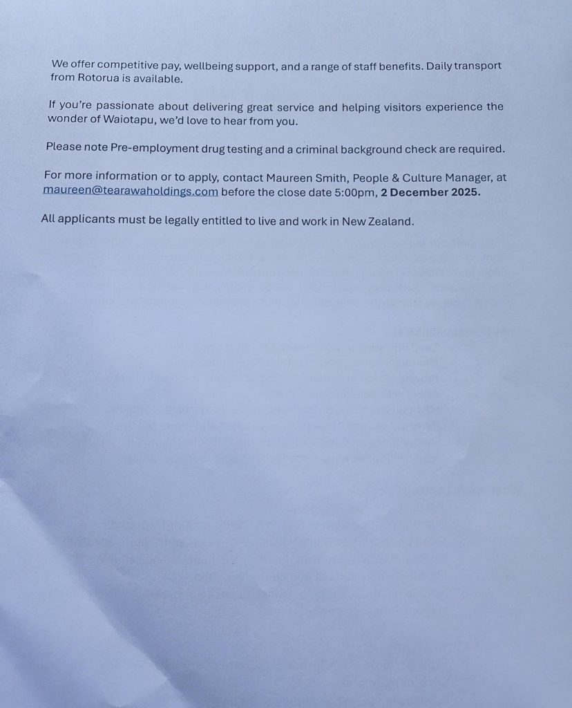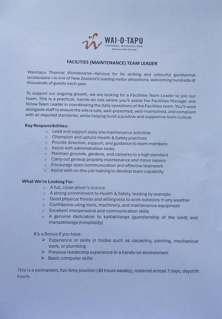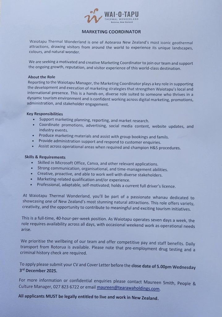 Waiotapu Thermal Wonderland is excited to announce that they are hiring for two permanent positions. See below.